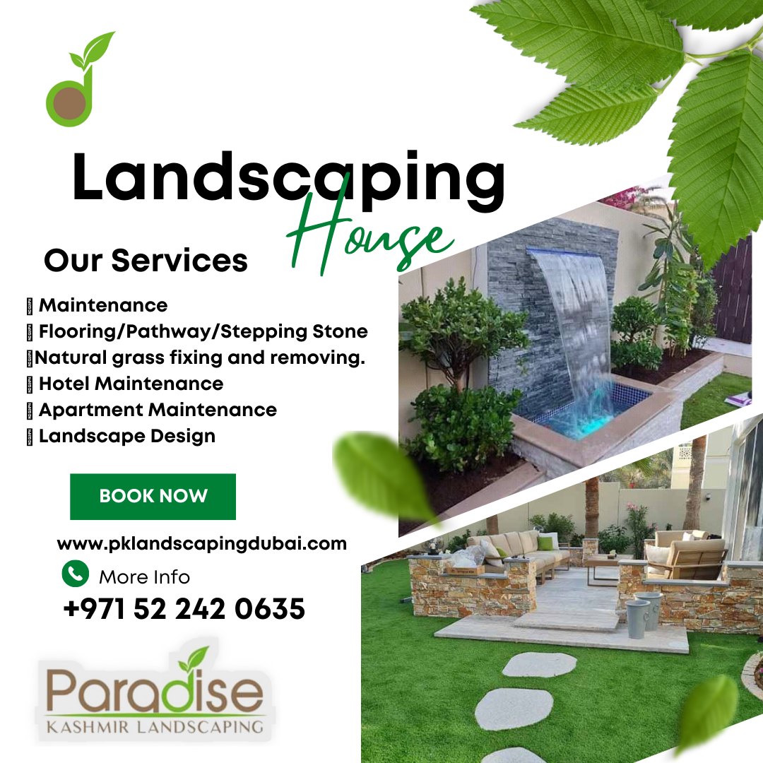 We are providing landscaping services in Dubai. Flooring/Pathway/Stepping StoneNatural grass fixing and removing. Hotel Maintenance Apartment Maintenance Landscape DesignArtificial grass fixing and supply.Plants fixing and remove. Interior Designing Garden LightingVilla paint work. Pergolas SunshadeFlower bed rasid and ground flower bed.Indoor plants and out plants supply.. Tree Installation Garden Lighting
