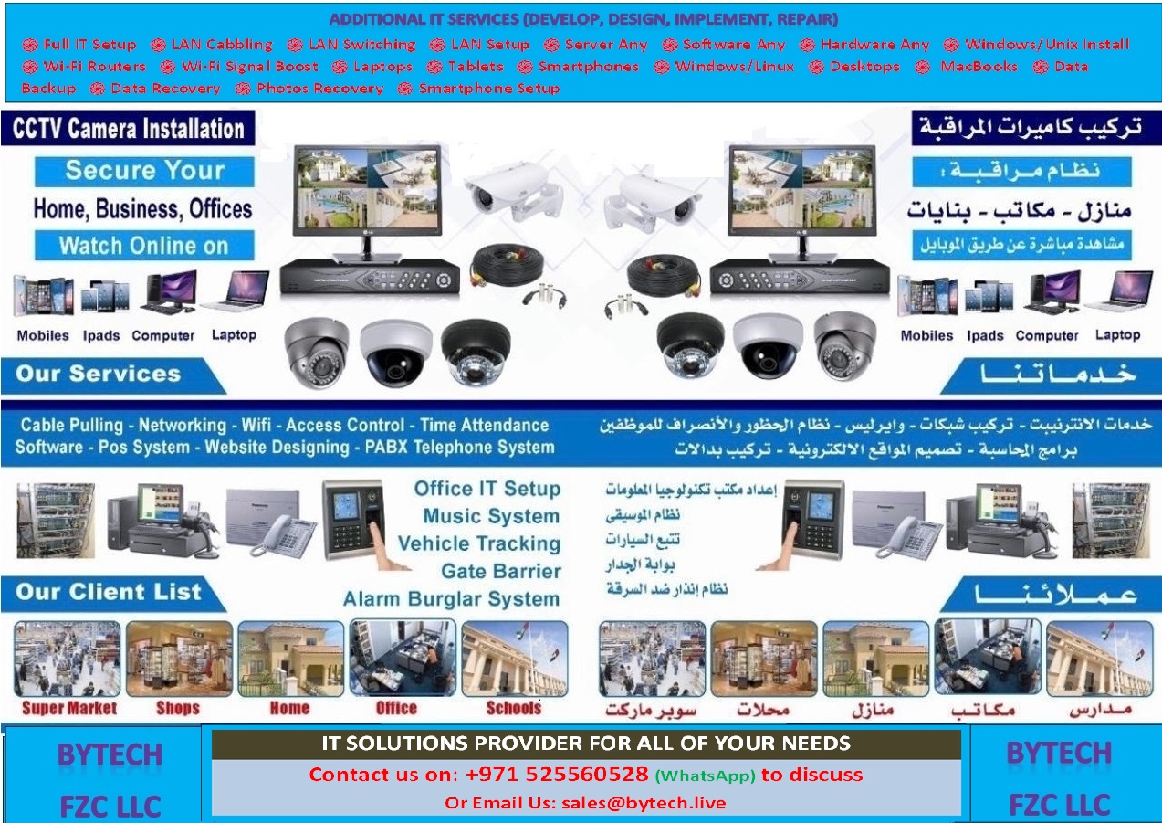 Comprehensive IT and technology installation services Residential and commercial solutions Installation and maintenance of CCTV surveillance cameras, Setting up SERVERS and SYSTEMS, PCs & LAPTOPS, DESKTOPS, SOFTWARE any, HARDWARE any, PRINTERS, DISH ANTENNA, SMART DEVICES, TABLETS, MOBILE PHONES, HOME COMMERCIAL SECURITY EQUIPMENT etc.  •Securing your home or office by professionally installing and maintaining surveillance cameras. IT SETUP for offices and homes •Customized IT solutions for efficient work and home environments. Networking services •LAN and WiFi Setup: Ensure seamless connection with professional LAN and WiFi installation. •Cable Installation: Professional Ethernet cable installation solutions for reliable communications. •Fixed telephone communication: setting up and maintaining traditional telephone systems. Safety equipment •Installing and supporting advanced security systems. Point of Sale (POS) Systems •Setting up dedicated points of sale to facilitate transaction processes. •Comprehensive server installation to support business operations. Back up and restore data •Protect your data with powerful backup solutions and data recovery services. LAN cables •Professional installation and removal of LAN cables to achieve the best performance. Website and mobile application development •Design and develop easy-to-use websites and mobile applications. Setting up and maintaining devices •Support for desktops, laptops, printers and smartphones, including setup and maintenance.