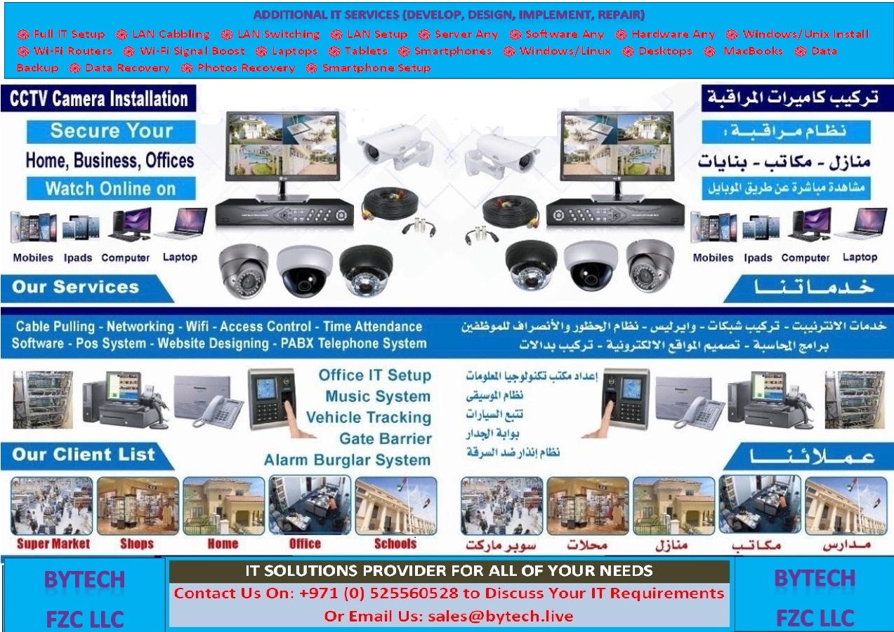 CCTV Installation/Repair, Office/Home IT Setup, Networking (Cable, Wi-Fi, Land Line Phone Connectivity, Security Equipment), POS, Servers/Systems Setup, Data Backup/Recovery, LAN Cabling, Ethernet Cable Installation/Removal, Dish Antenna Setup, Printer Setup, Website/Mobile Apps Development, Desktops/Laptops, Printers, Smartphones Setup, Repair, Maintenance, Software Development, Software/Hardware Installation and any other IT Service as per your need.