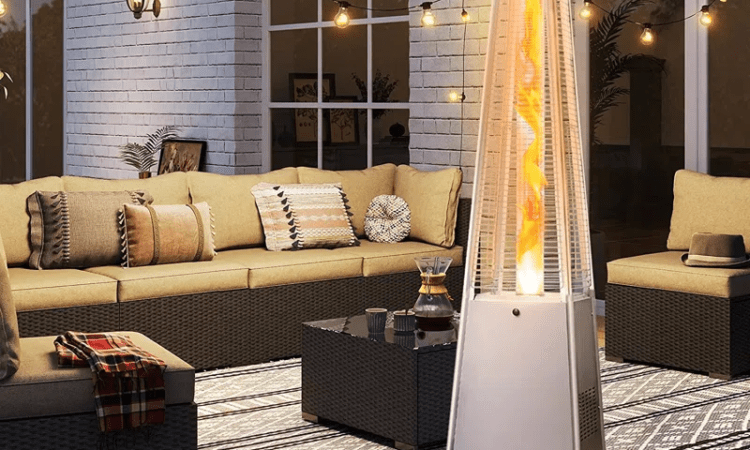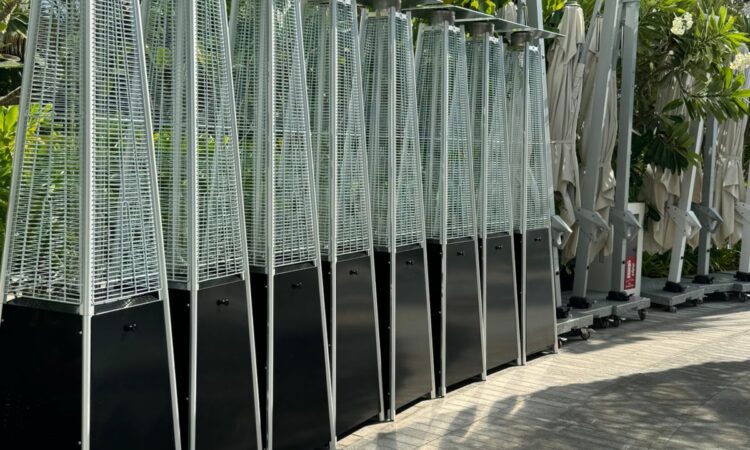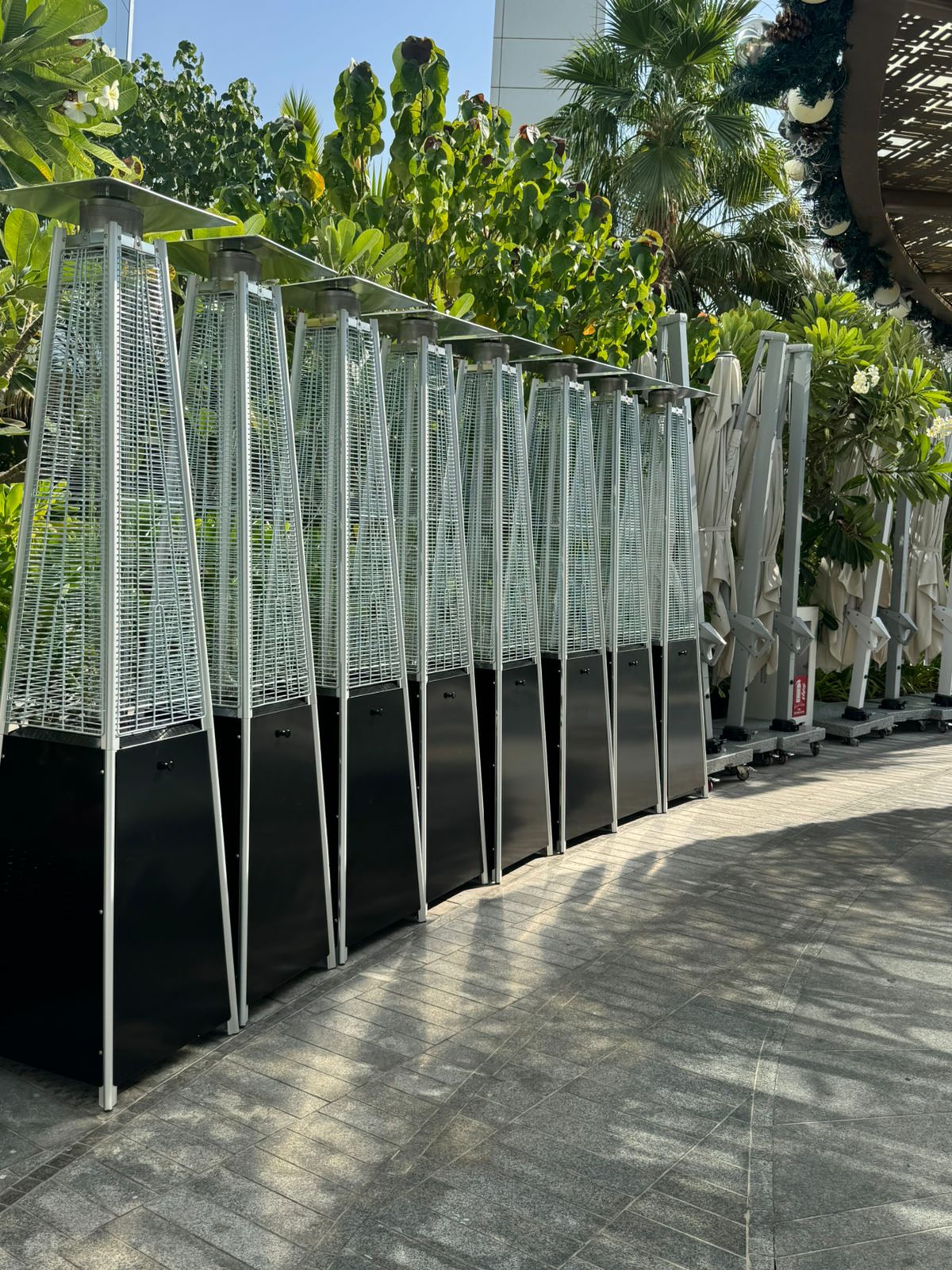 Pyramid design exceptionally beautiful and singular, fire driven, vertically, inside a glass tube.More than 6 meters in diameter heated area. Stainless steel construction and laminated aluminum. Simpers and reliable electronic ignition flame long, slender and beautiful.
