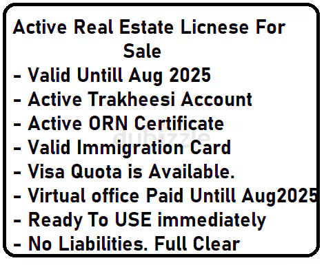I am Selling Active Real Estate License. This license Valid Until Aug 2025. This License has Active Trakheesi Account. You can issue BRN card, And Advertising permit Immediately. There are Active, Valid Visa Quota Available, You can hire Real Estate Employees. Virtual office is fully paid until Aug 2025. office is available for inspections. This license has no liabilities, Its not USED and fully clear. I am selling this way lesser price then Cost of new license