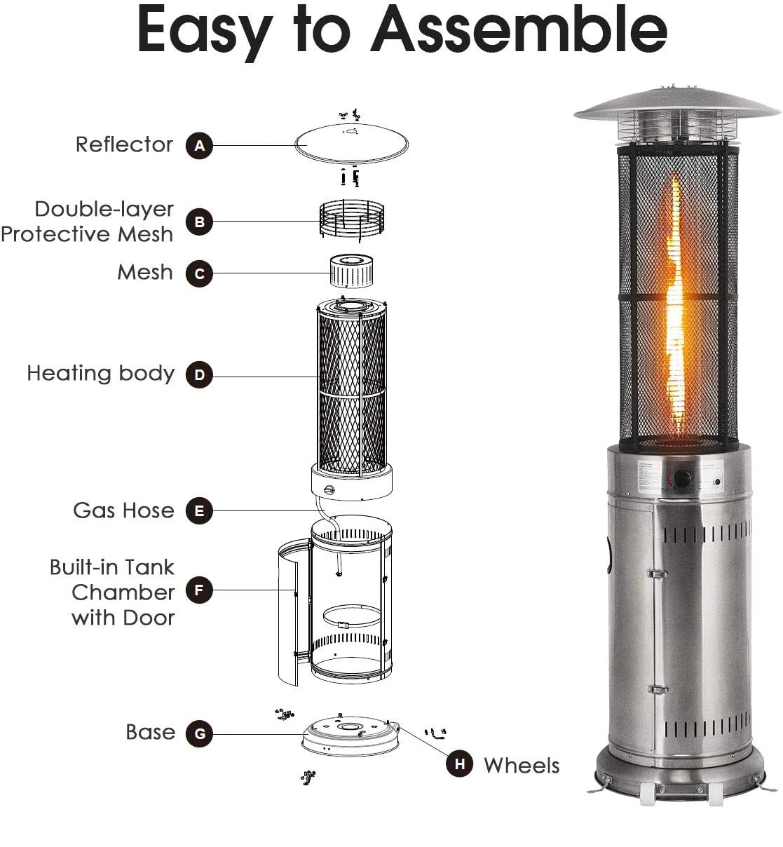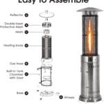 Multi-scene Applications: Made of high-quality steel and aluminum, the outdoor heater resists well to rust and deformation. And two bottom wheels makes it easy to move without lifting, saving much time and efforts. The heater is ideal for backyard, deck, garden and many other outdoor places. Assembly Required: The assembly is not that difficult as the heater is equipped with complete accessories and a detailed instruction. To make this heater work, you need to purchase a 20lbs propane cylinder tank by yourself. The overall dimension of the heater is 21” x 21” x 72” (L x W x H).