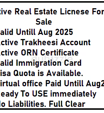 I am Selling Active Real Estate License. This license Valid Until Aug 2025. This License has Active Trakheesi Account....