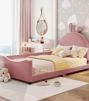 Olear Kids Upholstered Day Bed With Rabbit Ear Shaped Headboard Pink Velvet Fabric Bed
